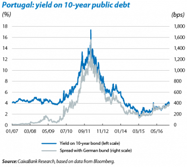 Portugal’s outlook improves. The Portuguese economy in Q4 2016 grew faster than most analysts expected (2.0% year-on-year, vis-à-vis the 1.6% forecast), supported by a more dynamic domestic demand, especially investment, and by exports. Growth in 2016 stood at 1.4% year-on-year. Over the coming quarters, the economy is expected to continue to grow at a similar pace. This is reflected in the consensus forecast for 2017 (1.5%) and 2018 (1.4%), in line with the Caixabank Research forecast. Nevertheless, Portugal’s debt financing costs remain high. On the one hand, this is due to investor concerns regarding the country’s banking sector and public finances. Adding to these idiosyncratic risks is the political uncertainty that is currently assailing the euro area, although we expect this uncertainty to dissipate over the year. Regarding the Portuguese banks, considerable progress has been made over the past few months to dispel the uncertainty hovering over the sector, which should help to push down the risk premium. Regarding public finances, the 2016 fiscal deficit looks set to be below 3% of GDP, which should allow Portugal to exit the Excessive Deficit Procedure with the European Commission. In fact, the Commission has already downgraded its public deficit forecast for 2016 from 2.7% of GDP to 2.3%. Nevertheless, public debt remains high, at around 130% of GDP, so Portugal cannot let its guard down.