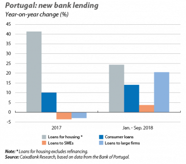 New bank lending shows solid growth. With data up to September, new bank lending for the purchase of housing grew by 24.3% (cumulative figure for the year to date), while new bank lending in the form of consumer loans rose by 14.1%. Despite this firm growth, in both segments there was a slight moderation in new bank lending compared to August (when the figures stood at 26.4% and 15.6%, respectively). This reflects the macroprudential measures implemented by the Bank of Portugal since July. Finally, new bank lending to companies showed stable growth of slightly over 13% year-on-year.