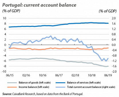 The public accounts show improvement thanks to revenues. In July, the government balance stood at –0.4% of GDP (–445 million euros) in cumulative terms for the year to date, which represents a substantial improvement compared to the –2.3% of July 2018. This improvement is supported by a significant increase in revenues (6.5% year-on-year), which is well above that registered in expenditure (1.6%). The most notable increase is that of tax revenues (+6.1% year-on-year), which accounts for around 80% of the increase in total revenues. The contained growth in expenditure, meanwhile, was due to the fall in interest payments and the low level of execution in investment.