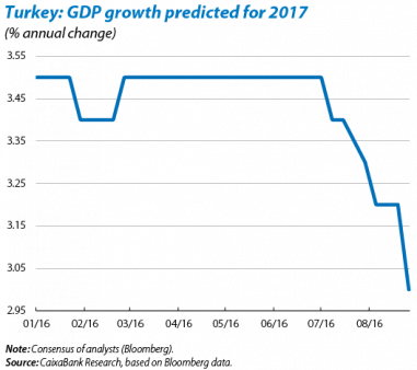 Brazil, Mexico, Turkey and Russia, four countries facing different emerging dilemmas. In Brazil, confirmation of President Rousseff’s impeachment, already relieved from her position, and doubts regarding the government’s ability to implement the necessary public adjustment, have kept its political situation as a source of uncertainty. As a result, the country’s exit of its recession is still complicated, as shown by the 0.6% drop in GDP in Q2 (–0.4% in Q1). Mexico’s national accounts system GDP figure was not positive either, surprising analysts by posting –0.2% quarter-on-quarter in Q2 (+0.5% in Q1). Nonetheless this should be seen as a temporary glitch, reflecting the Mexican economy’s twofold dependence (on the US and on oil). Turkey’s economy has also become a cause for concern due to uncertainty regarding future institutional developments in the country after the attempted coup in July, as well as other important geopolitical pressures. Lastly, in Russia the 0.6% year-on-year decline in GDP for Q2 was slightly less than expected, suggesting the country is gradually moving away from the severe phase of its recession, although the underlying sensation is still one of a fragile recovery.