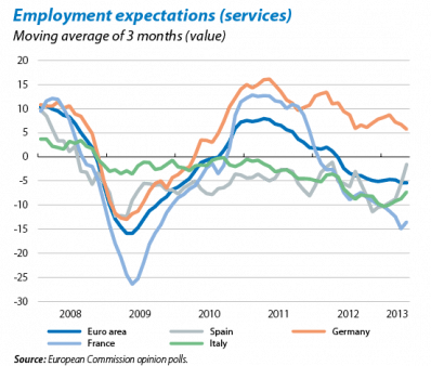 The situation of the labour market varies greatly from country to country. For the euro area as a whole, May's index for employment expectations over the next three months points to the labour market not getting any worse although, for the time being, neither is there any clear change in trend towards recovery. Spain has performed particularly well, especially in services as the average index for April and May (–3.6) is six points higher than the figure for the first quarter and close to the threshold as from which jobs are created. This variable also improved more than two points on average in the manufacturing sector during April and May compared with the first quarter, up to a negative value of 10.7 points. In Germany these indices have remained stable at clearly higher levels so that, for the time being, there is no doubting the capacity of the German economy to continue creating jobs in spite of its unemployment rate remaining at an all-time low. France, however, saw a slight upswing, but was still far below the euro area's figure of 13.5 negative points.