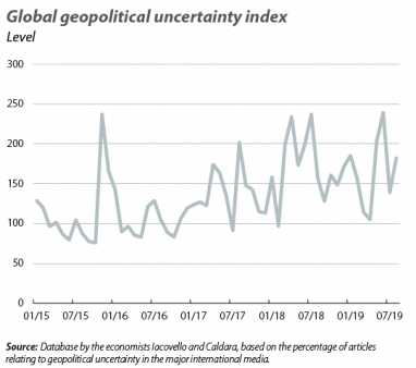 The uncertainty shock shows no sign of abating. Over the summer months, far from providing a respite, the main pockets of uncertainty of recent times have remained active: the trade tensions between the US and China have intensified, the EU’s political troubles (Italy, Brexit) have not been dispelled and the global geopolitical situation has been cause for alarm (notably the difficult circumstances in Hong Kong and Iran, among others). Furthermore, these dynamics have been compounded by volatility in financial markets and indicators which, generally speaking, have confirmed that the rate of economic activity is somewhat worse than a few months ago. This is a combination that has resulted in an intensification of doubts over the future path of global growth, and the risk of the latter being lower than expected has increased.