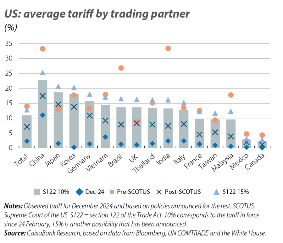 On the other hand, the US Supreme Court (SC) ruled in February that Trump exceeded the emergency powers invoked and has declared the tariffs imposed under the IEEPA illegal, but those approved under other regulations (on cars, steel, etc.) will remain in force. That is, the SC has declared the procedure used for the approval of the bilateral tariffs illegal, not the tariffs themselves. Trade uncertainty is now re-emerging as a period begins in which the Trump administration will explore all the legal avenues still available to continue implementing its tariff policy, which it has already made clear it will not abandon. In fact, Trump invoked Section 122 of the Trade Act to impose a universal 10% tariff, which has led to a «reconfiguration» of the tariff pressure. Countries such as China and Brazil will now have a much lower tariff than was in force prior to the Supreme Court's ruling, while the EU and the United Kingdom will lose out – so much so, that the EU has delayed the approval of the trade agreement reached in July of last year until there is more information and further clarity on this matter (see «10 questions about the US Supreme Court’s tariff ruling» in this same Monthly Report).