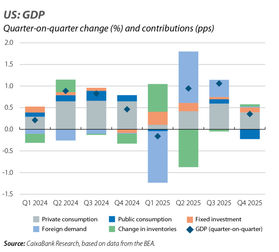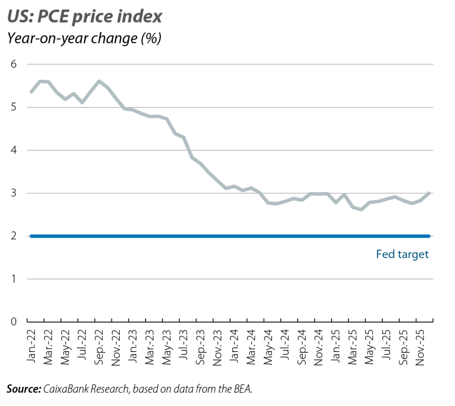The Supreme Court's announcement regarding Trump's tariff policy added to the disappointment with the Q4 2025 GDP figure: growth reached 0.4% quarter-on-quarter (almost half of what was expected by the consensus of analysts), following 1.1% in Q3 2025, and placed growth for 2025 as a whole at 2.2% (2.8% in 2024). The result of Q4 is explained almost entirely by the decline in public spending (–1.3% quarter-on-quarter vs. 0.1% average for the year), as a consequence of the shutdown. In fact, the rest of domestic demand ended the year very dynamically: investment and private consumption grew at a quarter-on-quarter rate of 0.6%. Foreign demand, meanwhile, made an almost negligible contribution in Q4. However, the slowdown in Q4 appears to have been temporary and in Q1 2026 we may see a certain «rebound» effect, once activity in the federal government has returned to normal. In this regard, February's PMIs paint a picture of an economy that continues to perform well (51.9, following the Q4 average of 53.8, with 50 being the threshold denoting positive growth). Nonetheless, in February household confidence according to the Conference Board barely recovered from the substantial drop in the previous month (+2.2 points, to 91.2, with 100 being the threshold), while the University of Michigan’s indicator has yet to regain the levels of prior to «Liberation Day». This lack of household confidence is mainly due, among higher incomes, to volatility in the financial markets, and among lower incomes, to the loss of purchasing power they face. In fact, inflation is showing a clear resistance to falling to the Fed's target: according to the PCE price index, core inflation rose by 0.2 pps in December, reaching 3.0%, while January's CPI showed that overall inflation fell by 0.3 pps to 2.4%, but core inflation only decreased by 0.1 pp to 2.5%.