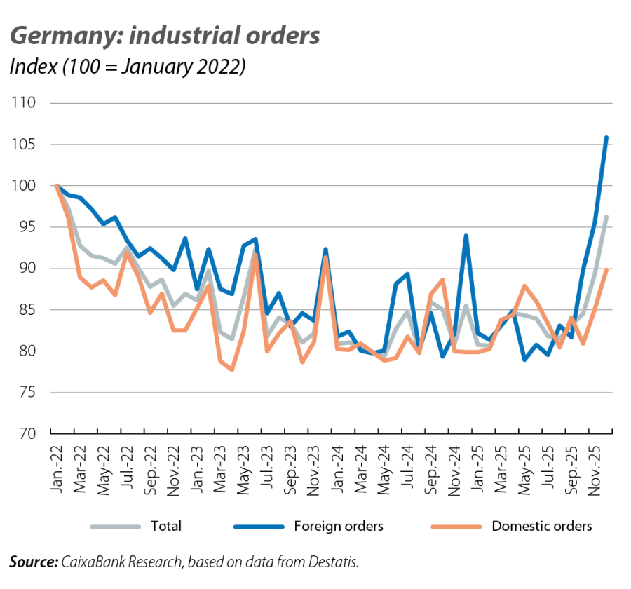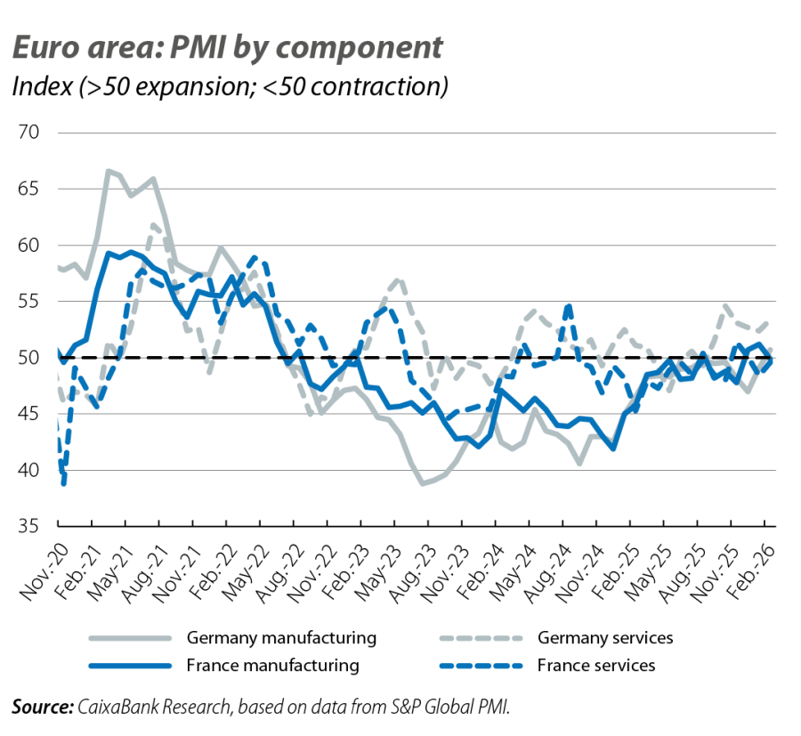 In fact, the PMI for the euro area rose by 0.6 points in February to 51.9, with activity in services continuing to grow, albeit at modest rates, and a manufacturing sector that is consolidating the positive shift initiated several months ago. This result is based on the recovery observed in Germany (+1.1 points, to 53.2) thanks to the continued momentum in the services sector and a manufacturing sector that is confirming a somewhat positive shift, albeit still with modest progress. Other opinion and business climate indicators contribute to this increased optimism towards the German economy, but with caution: in February, the ZEW shows that the percentage of respondents anticipating an improvement remains around 60%, while the Ifo increased, although it remains well below the threshold of 100 that denotes growth around the average rate (+1 point, to 88.6). Nonetheless, signs of recovery in the German economy are beginning to accumulate, particularly in the industrial sector: industrial orders grew by almost 13% year-on-year in December, anticipating a recovery in production in the coming months. France, for its part, seems to be confirming its position as the weakest link: the PMI remains below the 50-point threshold in February, due to weakness in both manufacturing and services, while consumer confidence remains weak and does not hint at any recovery in consumption in the short term. On balance, the euro area economy will continue to grow, albeit still below its long-term average, in a context in which inflationary pressures remain contained: in February, inflation rose by 0.2 pps, bringing the headline rate to 1.9% and the core index to 2.4%.