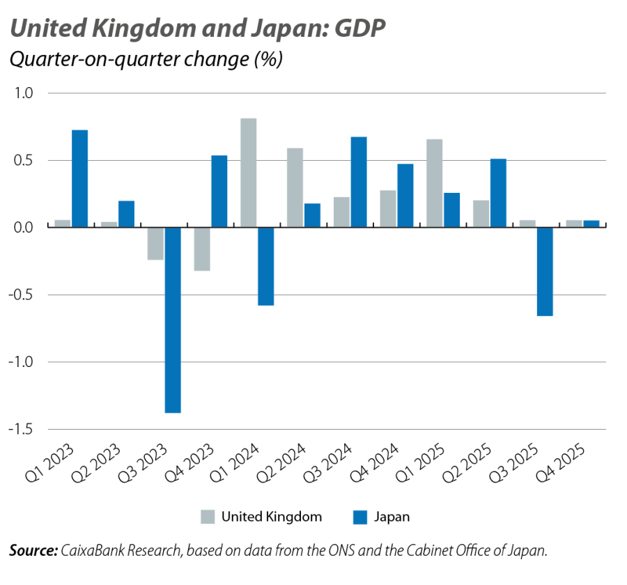 In the United Kingdom, GDP grew by 0.1% quarter-on-quarter in Q4 2025, confirming a steady slowdown over the course of the year that has led to a growth rate of 1.3% for 2025 overall (0.3% in 2024). The weakness observed in the main business and consumer surveys does not give us cause to anticipate any significant acceleration in activity in the short term. In Japan, growth in Q4 2025 barely reached 0.1% quarter-on-quarter, following the previous –0.7%, placing the 2025 average at 1.1% (–0.2% in 2024). Hopes for a revival of activity rest on the fiscal stimulus announced by the government, although the rise in sovereign interest rates may limit the effectiveness of fiscal and monetary policy in stimulating economic growth.