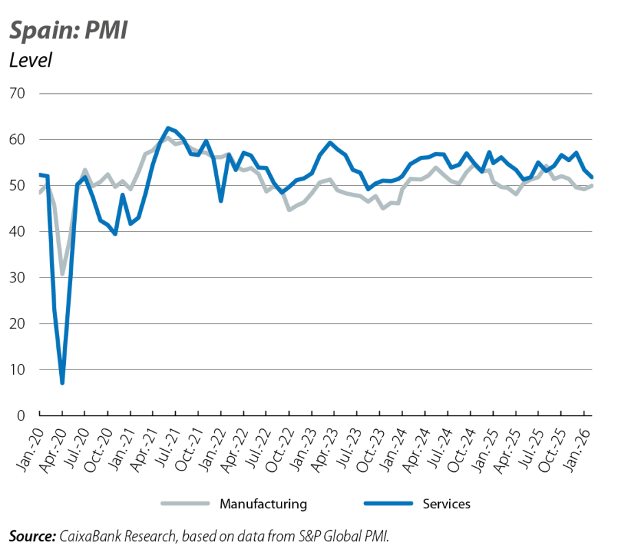 On the supply side, the PMIs also suggest that the growth rate remains positive and relatively dynamic, albeit probably somewhat more moderate. On the one hand, the manufacturing PMI appears to have bottomed out after several months of weakening, although it remains at relatively low levels. Specifically, in February it stood at 50 points, a level that typically delineates expansive territory from the contractive one, and slightly higher than the January figure. However, the average for Q1 stands at 49.6 points, well below the 51.1 points of Q4 2025. The services PMI is also weakening compared to the figures recorded at the end of 2025. In February, it stood at 51.9 points, leaving the average for the first quarter of 2026 to date at 52.7 points, well below the figures recorded at the end of 2025.