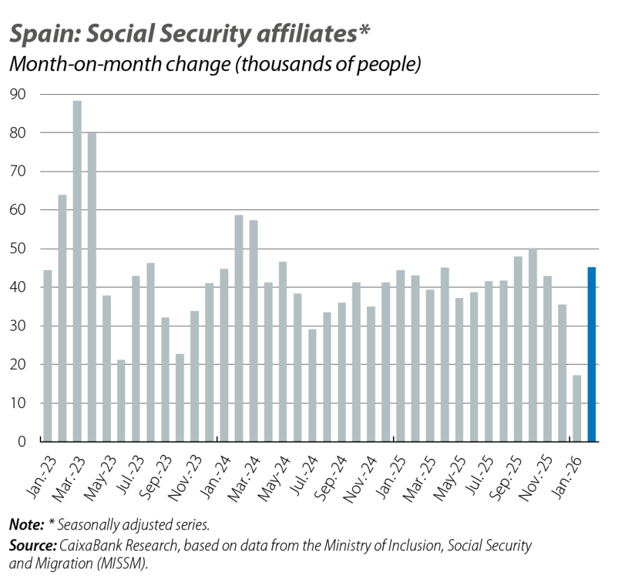 The labour market has also shown improvement at the start of the year. In January, the rate of job creation was just 17,000 social security affiliates in month-on-month and seasonally adjusted terms, far from the 42,000 recorded on average in 2025. In contrast, in February the increase was 45,000 affiliates, a figure consistent with the dynamic growth rate of the past year and indicating that the dip at the beginning of 2026 was temporary. In fact, in the first two months of the year, the average seasonally adjusted rate of job creation reached 31,000 affiliates per month. If this trend continues throughout the year, new registrations in 2026 would exceed approximately 375,000, only just shy of the forecast of 400,000 net affiliations, excluding the effect of the exceptional amnesty announced by the government.