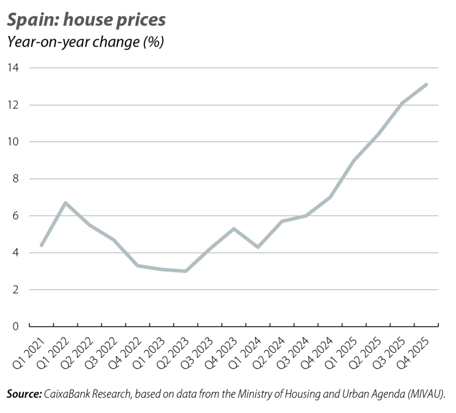 In any case, the pressure from demand continues to be reflected in prices in a context where supply is growing at a more moderate pace. The appraisal value of unsubsidised housing according to the Ministry of Housing and Urban Agenda (MIVAU) rose by 13.1% year-on-year in Q4, the largest increase of the current cycle. Although prices are reaching new nominal highs, in real terms they remain 25% below 2007 levels. Taken together, the recent data reinforce a scenario characterised by the structural housing deficit, which is likely to continue exerting pressure on prices.