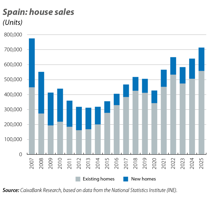 The housing market is showing a trend similar to that of other indicators: the level of activity is high, but the growth rate is losing momentum. This is reflected in the trend in sales: 2025 closed with 714,237 transactions, a historically high level (between 2014 and 2019 an average of 428,000 sales were closed per year). However, the growth rate has been weakening in recent months: during the first half of the year, the average growth in sales was 20.9% year-on-year, a figure that contrasts with the 4.5% average in the second half.