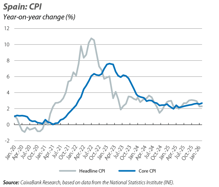 The Spanish economy closed 2025 with solid growth and has kicked off 2026 with figures that remain strong, albeit somewhat lower than those of last year. Together, the indicators published to date are consistent with CaixaBank Research’s forecast scenario, set out in the Focus «The Spanish economy in 2026» in this same Monthly Report, which anticipates GDP growth of 2.4% for this year. This allows the economy to tackle the potential consequences of the war that has erupted in the Middle East from a somewhat more comfortable position compared to other economies, but it is still too early to assess the consequences it could have. These will largely depend on the duration of the conflict and its impact on energy prices, trade routes and, ultimately, on global financial conditions and agents’ confidence. Right now, the risks are clearly skewed to the downside.