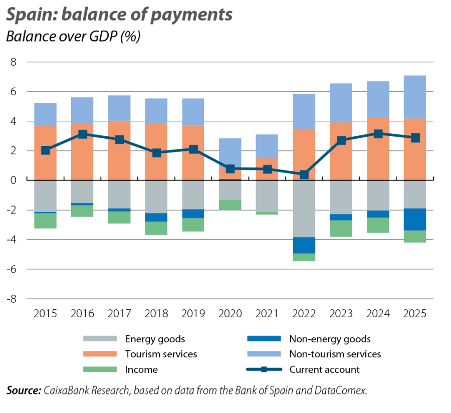 Despite the challenging international context, the foreign sector has remained a source of support for the Spanish economy to date. In 2025, the current account closed with a surplus of 2.9% of GDP, a level slightly below the 3.2% of the previous year, but still above the 2.3% average recorded during the period 2014-2019. Beneath this overall result lie opposing dynamics. On one hand, the trade balance deteriorated significantly in an environment marked by higher tariffs and reduced trade flows with the US. However, this deterioration was offset by the improvement in the services surplus, which reached 7.1% of GDP, thanks to the dynamism of non-tourism service exports, while the tourism surplus recorded a slight slowdown.