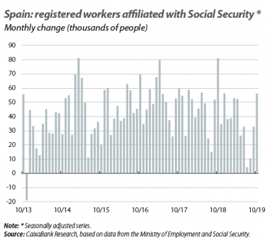 Gradual slowdown in the labour market, in line with the lower growth of the economy. The number of people registered with Social Security rose by 2.3% in October (2.4% in September), representing an increase of 436,920 in the number of people who have registered in the past 12 months. Over the same period, the number of people in unemployment fell by 77,044. By sector, Social Security affiliation in the industrial sector registered a moderate pace of growth of 1.2% year-on-year, 1 decimal point lower than the figure for September, while growth in affiliation in the construction sector slowed to 3.7% year-on-year, 4 decimal points lower than in September. Affiliation in the tourism and services sectors, meanwhile, maintained its growth rate at 2.7% and 2.8% year-on-year, respectively.