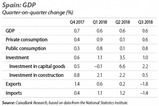 Moving towards a gentle slowdown in growth. With the year almost at an end, and with official GDP growth data for three of the four quarters of the year, indicators suggest that the Spanish economy will have grown by around 2.5% in 2018, a figure very much in line with the 2.4% projected in our scenario a year ago. This represents a gentle slowdown following three years of exceptionally strong growth – at rates above 3% –, in which the Spanish economy was favoured by a number of factors that gave further impetus to the recovery that was already underway (such as the decline in oil prices, the reduction of interest rates and the depreciation of the euro). This gentle slowdown in growth will continue into 2019, when we expect the economy to grow at slightly above 2%. This is a lower rate than previous years, but higher than that forecast for most developed economies, as well as being more sustainable in the long term. A similar outlook is suggested by the latest forecasts published in November by the International Monetary Fund (IMF), in its annual analysis (the so-called «Article IV»). In it, the Fund predicts a 2.2% growth for 2019 and reiterates that the moderation in growth is a result of reduced momentum in the cyclical support factors, as well as a more adverse international context. The IMF also stresses the need to reduce public debt, which remains high (at around 98% of GDP) despite the reduction of the deficit in recent years. This reflection coincides with the assessments made by the European Commission in relation to the 2019 draft budget submitted by the Government to Brussels.