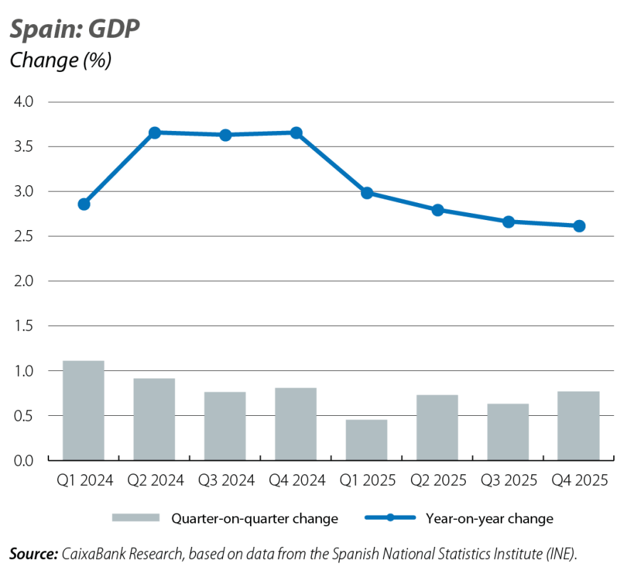 GDP grew by 0.8% quarter-on-quarter in Q4 2025, above the 0.6% recorded in Q3, while the year-on-year rate stood at 2.6%, just 0.1 pp less than in the previous quarter. The latest GDP data, which are better than initially expected, mean a higher starting point for 2026 and create a carry-over effect that will lead us to revise upwards our growth forecast for this year, currently at 2.1%.
