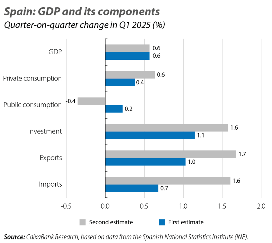 Despite the trade tensions stemming from the US’ tariff policy and the geopolitical conflict between Israel and Iran, the economic activity indicators have shown significant buoyancy, suggesting a solid performance in Q2. In addition, the revision of the GDP figure for Q1 did not change the good aggregate result (0.6% quarter-on-quarter), but it did lead to significant revisions in the components, reflecting a robust composition of this growth. Specifically, the revised figures reveal that it was sustained by private consumption (0.6% quarter-on-quarter growth), investment (1.6% quarter-on-quarter) and the foreign sector, with exports growing by 1.6% quarter-on-quarter (very similar to the growth of imports), driven by the strength of non-tourism services.