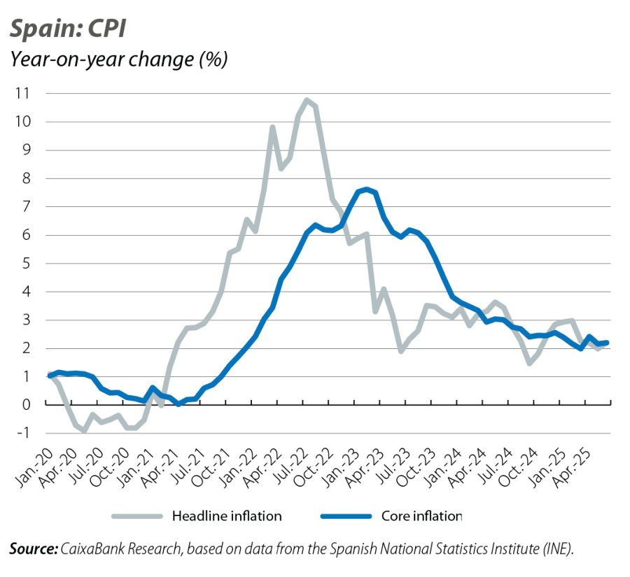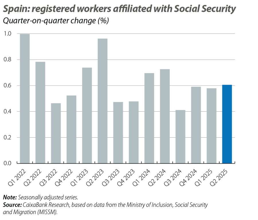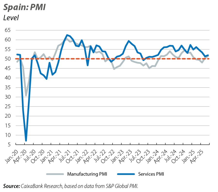 The indicators related to employment and consumption have been positive in Q2. Employment growth, measured by the number of registered workers affiliated with Social Security, remained robust and increased in Q2 by 0.6% quarter-on-quarter (corrected for seasonality), matching the rate of the previous quarter. In addition, the total number of affiliates reached 21,861,095 workers, marking a new record and standing 468,206 above the level of a year ago. On the other hand, the CaixaBank Research Monitor’s domestic consumption indicator has shown higher year-on-year growth rates in Q2 than in Q1. As for the business sentiment indices, June was a good month: the manufacturing PMI once again stood in expansive territory (above 50 points) for the second consecutive month, specifically at 51.4 points, exceeding the 50.5 points recorded in May. The services PMI, meanwhile, stood at 51.9 points in June, slightly above the 51.3 points recorded in May. Considering the available data as a whole, quarter-on-quarter GDP growth in Q2 could be around 0.5%. The first estimate for Q2 GDP will be published on 29 July, after the close of this edition.
