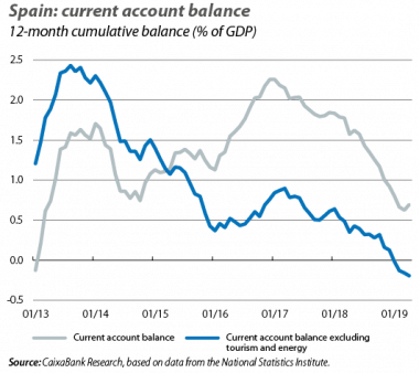 Respite in the deterioration of the current account balance. The current account balance improved in April, climbing to 0.7% of GDP (12-month cumulative balance), versus 0.6% in March. However, compared to April 2018 this figure still represents a reduction in the surplus of 0.9 pps. This deterioration is mainly attributable to the balance of non-energy goods (0.4 pps), the balance of services (0.3 pps) and, to a lesser extent, the energy balance (0.2 pps). The net international investment position (NIIP), meanwhile, stood at -77,7% of GDP in Q1 2019, which represents a slight deterioration compared to the previous quarter. All in all, over the past 12 months there has been a substantial improvement (of 6.1 pps), largely thanks to the revaluation of instruments in the debt portfolio.