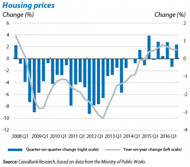 Better flows of mortgage loans boost the new upward cycle in the real estate sector. Another sign of the economy’s good performance is the increasingly unquestionable recovery in the real estate sector. Valuations of non-subsidised housing have seen positive growth in year-on-year terms for the past seven quarters. They rose by 1.5% year-on-year in 2016 Q4 (0.8% in quarter-on-quarter terms), bringing the average increase in 2016 to 1.9%. House prices are expected to continue rising over the coming months, boosted by demand and the shortage of housing in some prime zones.