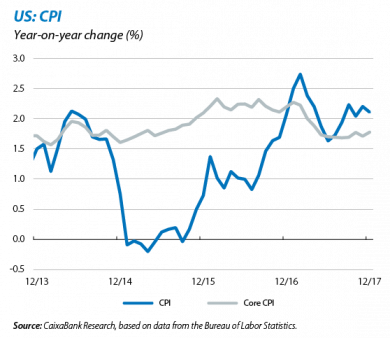Inflation is about to get higher. This diagnosis is supported by the expected trend in inflation. In December, the CPI grew by 2.1% year-on-year, in line with the figures posted the past few months. But such contained increases will more than likely give way to greater inflationary tension in 2018, especially as from Q2. This reinforces the CaixaBank Research scenario regarding the Fed’s monetary normalisation, with three interest rate hikes in 2018, bringing the fed funds rate to 3.25% by the end of the year.