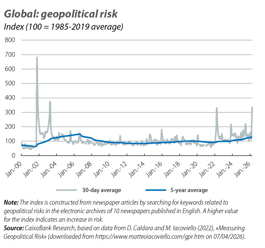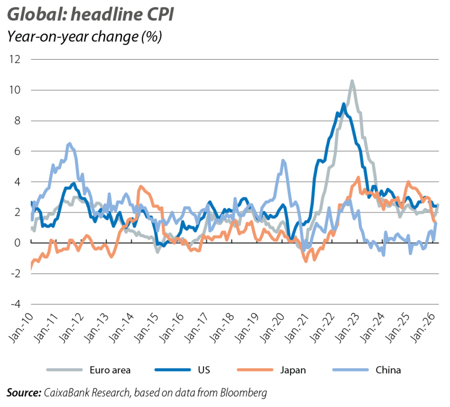 Amid rising energy prices, headline inflation in the euro area increased by 0.6 percentage points in March to 2.5%, while core inflation (which excludes food and energy) fell to 2.3% (vs. 2.4% previously). The energy component has shifted from a 3% year-on-year decline in February to a 5% year-on-year increase in March. In contrast, price pressures eased in the rest of the consumer basket, particularly in services, where inflation returned to 3.2% year-on-year following the rebound in February. These figures reflect favourable dynamics prior to the conflict in the Middle East, although in the future they could be affected by rising energy costs, as well as the key question for the ECB of whether this increase will spread to the rest of the basket. In the US, inflation remained stable in February: 2.4% year-on-year in headline inflation and 2.5% in the core index, the same as in January. On the other hand, the private consumption deflator shows underlying inflation still above 3%, while the producer price index rose by 0.5 pps in February to 3.4%. These inflationary pressures are more intense than in the euro area and could imply a more cautious trajectory than anticipated on the part of the Fed.