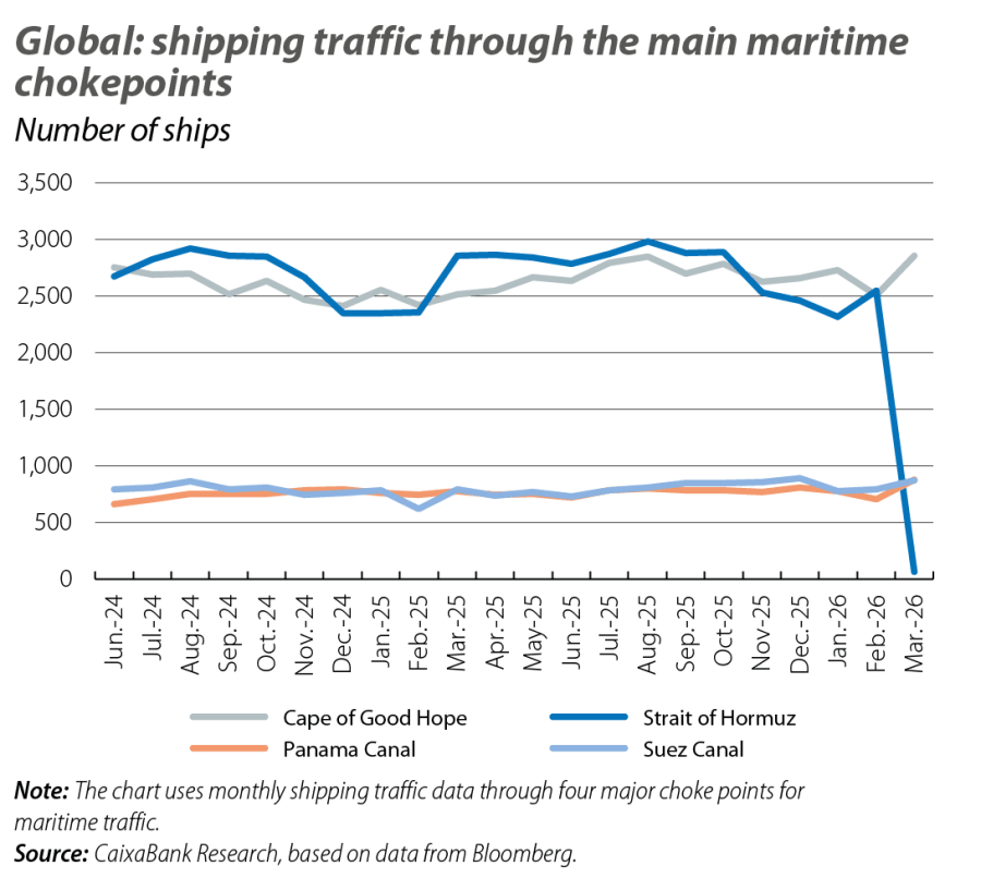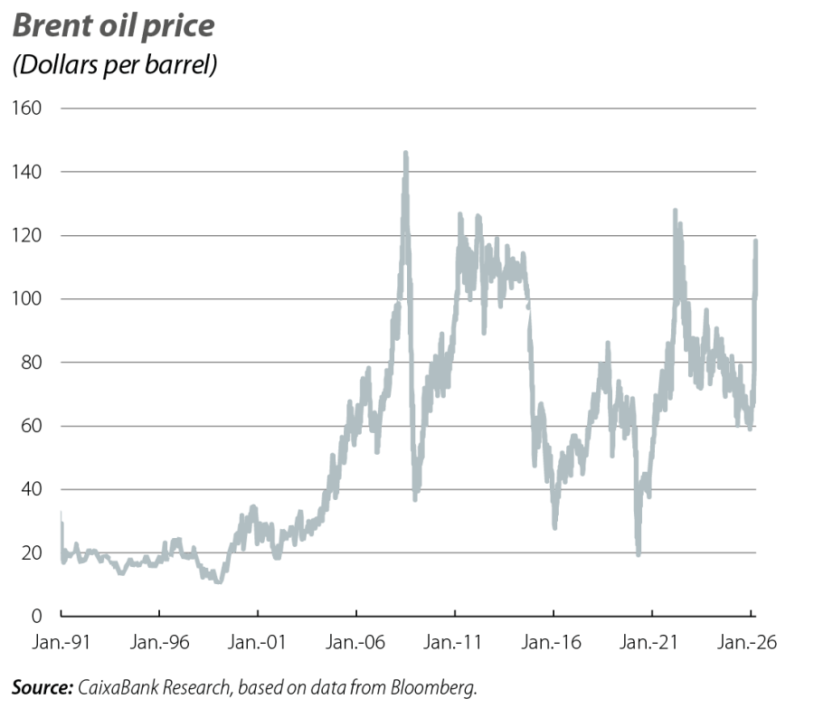 Faced with the largest oil shock in decades, the global economy is bracing for the consequences of the closure of the Strait of Hormuz, through which around 20% of the oil and LNG produced and consumed globally flows. Throughout March, the conflict was characterised by heightened volatility in the financial markets, most notably in energy markets (see the Financial Markets - Economic Outlook section). Despite the uncertainty over two key variables – namely, the duration of the conflict and the extent of damage to key infrastructure – the price of Brent was close to 100 dollars per barrel (around 70 dollars in February), while futures prices for delivery through to the year end exceeded 80 dollars. On the gas side, prices were above 50 euros per MWh in contracts until next winter. These prices are compatible with scenarios involving a short-lived conflict and limited damage to productive capacity in the Gulf region, albeit with a long tail of downside risks.
