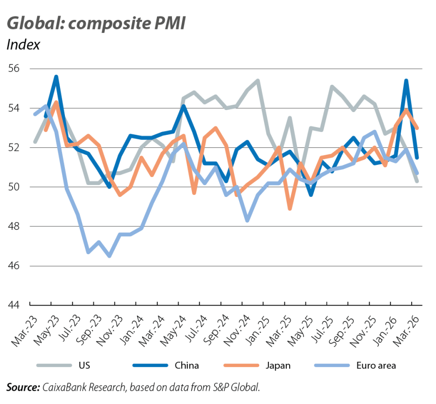 The euro area PMIs show mixed patterns in March. The services index fell to 50.2 points (vs. 51.9 previously) and that of manufacturing rose to 51.6 points (vs. 50.8 previously). The price subcomponents indicate a rise in input costs that is not yet being passed on to final prices. By country, France was in contractionary territory (48.8 points vs. 49.9 previously), while Germany remained in the expansionary zone, although it also shows a significant decline (51.9 points vs. 53.2 previously). The main German business confidence indices confirm the deterioration in sentiment in March. The Ifo fell by 2.0 points (to 86.4, below the 100-point benchmark), due to the sharp decline in the expectation component, while the ZEW index shows that the percentage of respondents anticipating a deterioration in activity rose sharply this month. In the US, the services PMI also recorded a decline (49.8 points vs. 51.7 previously) and the manufacturing PMI rebounded (52.3 points vs. 51.6 previously) thanks to increased dynamism in production and new orders. The US PMI also indicates a sharp rise in production costs and a rapid pass-through to final prices, with this subcomponent recording its most pronounced increase since 2022.