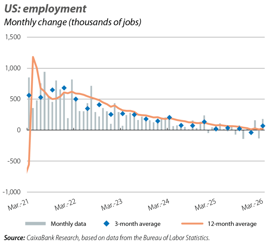 The second estimate of the Q4 2025 GDP figure placed its quarter-on-quarter growth at 0.2%, compared to 0.4% in the first estimate, leaving its average growth in 2025 at 2.1% (vs. the previous 2.2%). In particular, the quarter-on-quarter growth of public consumption was revised downwards to –1.5% (–0.2 pps), reflecting that the federal government shutdown had a greater impact than expected. Private consumption and investment also experienced slight downward revisions, but maintained dynamic growth rates. On the other hand, the sharp increase in employment in March (+178,000 jobs) is mainly explained by temporary effects, such as the reversal of strike effects and milder weather, rather than by any structural upturn in the labour market. The biggest increases were in sectors such as healthcare, construction, leisure and manufacturing, while the declines continued in technology, information and financial services. Average job creation in the US, meanwhile, stood at 68,300 jobs in Q1, with a recent trend indicating a practically stagnant labour market.