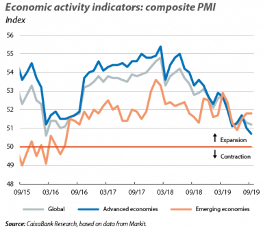 Growth moderates in the second half of 2019. This is reflected in indicators such as the global composite Purchasing Managers’ Index (PMI), which has been in decline for the past few months and stood at a rather modest level in September (51.2 points). This is largely due to the weakening of global trade and the widespread cooling of the manufacturing sector (the manufacturing PMI index remains below the 50-point threshold that separates expansive and contractionary territory). However, the services sector remains resilient (the services PMI index remains well above the 50-point threshold), at least for now, which mitigates the slowdown in economic activity growth. This less buoyant environment is also reflected in the latest update of the IMF’s macroeconomic projections, in which the institution once again reduced its growth forecasts for the global economy in 2019 (from the 3.2% published in July down to 3.0%), for both advanced and emerging economies, and maintained the balance of risks skewed to the downside. The IMF’s downward revision largely reflects the negative impact of the protectionist measures implemented by the US and China to date, as well as the indirect negative consequences of the trade tensions between the two countries. Despite this revision, the IMF expects a slight upturn in global growth in 2020 up to 3.4% (reasonably in line with CaixaBank Research’s forecast of 3.2%), supported by the improvement in economic activity in several emerging economies.