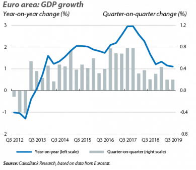 Meanwhile, economic activity in the euro area holds steady. In particular, GDP growth for the euro area remained stable at 0.2% quarter-on-quarter (1.1% year-on-year) in Q3 2019, slightly above our forecasts and analysts’ consensus (0.1% quarter-on-quarter). All in all, growth remains at modest levels. This is particularly due to the weakness of industry and the foreign sector (both penalised by the slowdown in the global economy and the environment of global uncertainty brought about by the trade tensions between the US and China and the unknowns surrounding Brexit, among other factors), in addition to other idiosyncratic restrictions such as the sectoral shock in the automotive industry. All these elements are affecting Germany the most, a country for which the Q3 GDP figure has not been published yet. Among the countries for which we do have data, France performed particularly well, with growth remaining at 0.3% quarter-on-quarter in Q3 (1.3% year-on-year), as did Spain (0.4% quarter-on-quarter). In contrast, the Italian economy continued to muddle through (with growth of 0.1% quarter-on-quarter and 0.3% year-on-year).