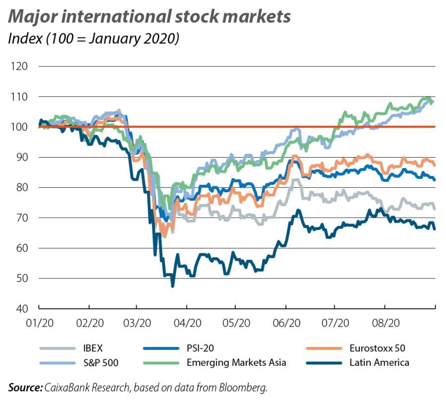 Investors’ optimistic tone was well reflected in the widespread recovery of the major global stock markets throughout July and August. In general, the improvement was led by sectors more sensitive to the business cycle, while, by region, significant gains were registered in China (where economic activity has rebounded significantly) and the US (favoured by the stock prices of technology and e-commerce companies). In both countries, the trading floors closed August having comfortably exceeded pre-pandemic levels and registering new highs for the year. By contrast, while stock market gains were also registered in Europe as a whole, at the end of August they showed more disparity and still amassed significant losses compared to the end of 2019. At one extreme, the decline of the Spanish Ibex 35 index since the beginning of the year was close to –30%, while at the other, the German DAX ended August just 2% below its 2019 close. In the middle of the spectrum, losses still accumulated in Italy, France and Portugal at the end of August stood at around –15%. Similarly, emerging markets experienced a general upward trend, but performed much better in Asia (MSCI index +12.5% since the end of June and +7.2% in the year to date) than in Latin America (+3.7% and –33.7%, respectively). Among the more fragile emerging markets, meanwhile, Turkish stock prices performed particularly poorly (Istanbul stock market –7.4% in July-August as a whole).