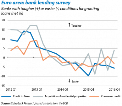 Credit recovers, boosted by the ECB and domestic demand. The bank lending survey for 2016 Q1 indicates further relaxation in the criteria for granting loans to companies and for household consumption, as well as in the financing conditions of the loans granted. Banks point to low financing costs and competition as the main reasons for these easier conditions. With regard to the loans requested, the survey shows a rise in net demand by firms and households. Consequently both supply and demand factors are favourable for credit to flow towards companies and consumers.