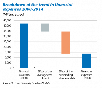 The second factor, better financial conditions, has helped to improve capital rents. Although it is true that low interest rates have reduced the amount of interest earned, on the whole households have benefitted from low interest rates thanks to a larger drop in interest paid. This decrease in financial expenses is largely the result of the considerable deleveraging effort being made by households, which have reduced their debt by 13 pps of GDP since 2008. Moreover the average cost of debt has also fallen from the 4.6% reached in 2008 to 1.8% in 2014 (see the first graph).