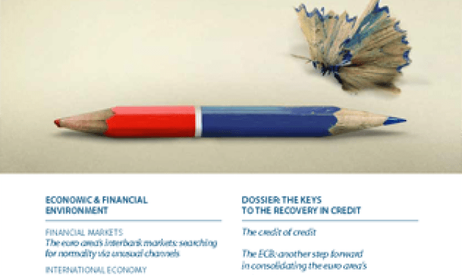 October 2014| No. 383DossierThe keys to the recovery in creditContent available in catalan spanish Print Download File Editorial Melancholy in the euro area Jordi Gual Key points of the month An uneven recovery Forecasts and indicators ForecastsKey indicators financial marketsKey indicators international economyKey indicators European UnionKey indicators Spanish economy Financial markets Economic outlook Diverging paths for the US and euro area Focus The euro area's interbank markets: searching for normality via unusual channels Focus Household finances after the crisis: the temptation of risk International economy Economic outlook Not as weak as it seems Focus Brazil: a rough patch in the short term, significant challenges in the long Focus International trade: what lies behind the figure European economy Economic outlook Lethargy dominates the euro area Focus The relationship between the value of the euro and inflation Focus The impact of the Russian crisis on Germany and Central Europe Spanish economy Economic outlook The recovery looks like continuing Focus The deterioration in the income balance: reasons and trends Focus On the upswing in household consumption in Spain Focus Changes in Spain's real estate sector DossierThe keys to the recovery in credit Focus The cost of bank debt: a thing of the past Sandra Jódar Rosell Focus The credit of credit Oriol Aspachs Focus The ECB: another step forward in consolidating the euro area's recovery Ariadna Vidal Martínez Focus A lower cost of equity for banks Pau Labró