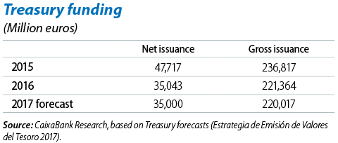 Debt maturities totalling 185,017 million euros will have to be covered in 2017. Moreover, the Treasury plans net issuances of an additional 35 billion euros, raising funding needs to more than 220 billion euros. As in the last few years, the Treasury is going to finance this new debt by issuing medium and long-term bonds, so the average maturity of public debt will continue to rise. In 2016 this reached 6.8 years, a similar figure to the one recorded at the start of the crisis. Lengthening the average maturity helps to reduce refinancing risk, particularly important when a large amount of debt needs to be renewed each year.