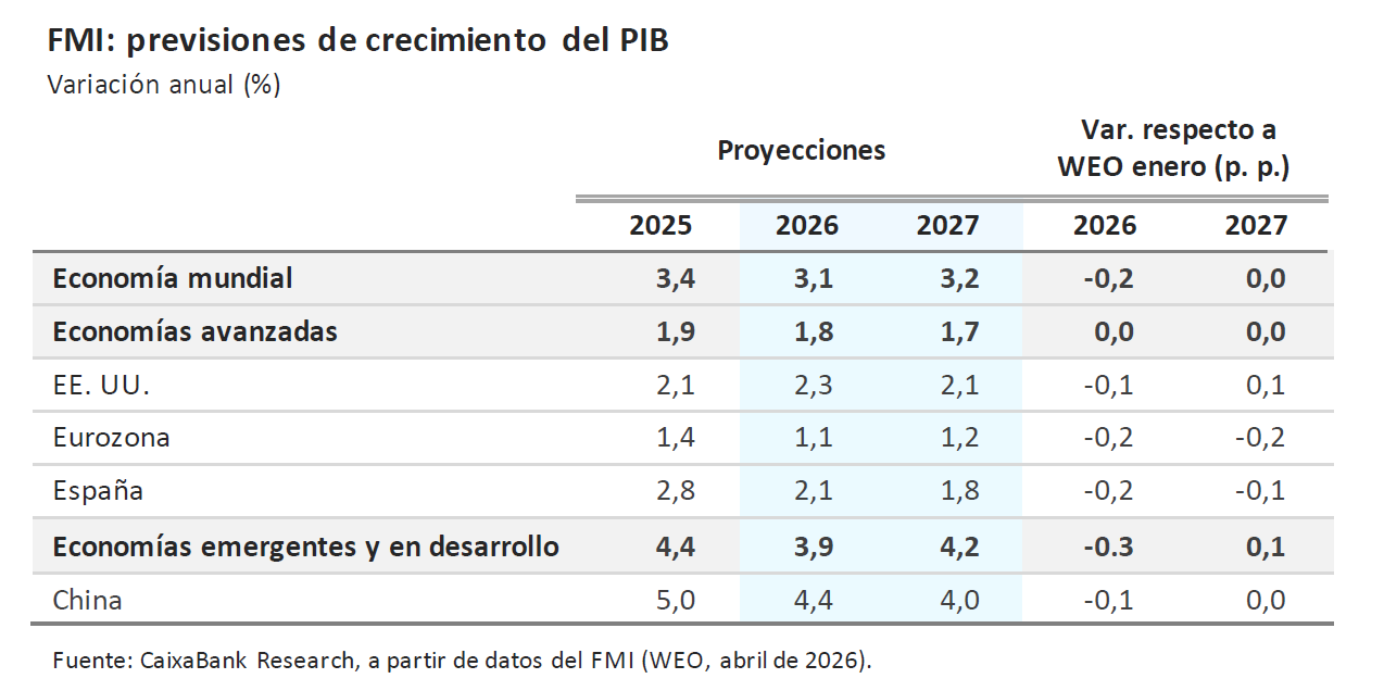 En su nuevo informe de previsiones, el FMI alertó de las consecuencias del conflicto en Oriente Próximo. El Fondo destacó el buen punto de partida de la economía global a inicios de 2026, apoyada en la resiliencia de 2025, menores aranceles estadounidenses (respecto a los anuncios iniciales), condiciones financieras favorables y el boom tecnológico asociado a la inteligencia artificial. Pero el conflicto en Oriente Próximo frena esta dinámica, con el cierre del estrecho de Ormuz y el daño a infraestructuras críticas amenazando con una grave crisis energética si la guerra continúa. En su escenario base, el FMI asume una normalización relativamente rápida de la situación, que posicionaría el precio del barril de crudo en torno a los 80 dólares de media en 2026 y tendría un impacto económico moderado: el PIB mundial crecería alrededor de un 3% y la inflación aumentaría 0,3 p. p. respecto a 2025. Con todo, el FMI remarca que todo dependerá de la duración, magnitud y secuelas del conflicto. Así, presentó escenarios alternativos en los que el estrecho de Ormuz permanece cerrado más tiempo y se producen daños estructurales en las infraestructuras: un escenario adverso, con el petróleo en los 100 dólares en 2026 (75 dólares en 2027), y otro severo, con un estrés mayor y más persistente (petróleo en 110 dólares en 2026 y 125 en 2027). En ambos casos, la economía mundial flirtearía con la recesión, si bien los impactos regionales serían muy heterogéneos (más modestos en EE. UU. y más severos en Asia y en las economías emergentes en general, con Europa en una situación intermedia). Con todo, el FMI remarca que la situación es distinta a 2022 y aboga por una política monetaria concentrada en anclar las expectativas de inflación y una política fiscal con ayudas focalizadas, temporales y que no eliminen la señal informativa de los precios.