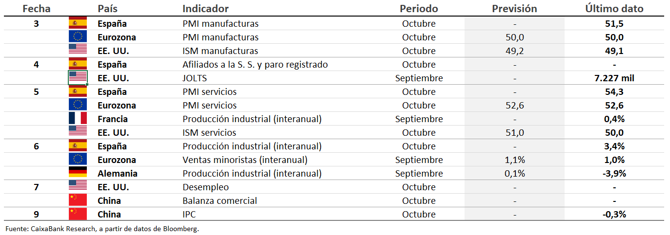 EE. UU. inicia el 4T con buen pie, con una inflación que, por ahora, sigue contenida. Los últimos indicadores adelantados sugieren que la economía estadounidense inició el 4T con buen tono. El PMI compuesto subió en octubre hasta 54,8 puntos, su nivel más alto en tres meses, impulsado por los servicios (55,2) y un leve avance en la manufactura (52,2). Sin embargo, la encuesta sugiere que el empleo creció a menor ritmo y las expectativas a futuro se enfriaron, con la incertidumbre política y los aranceles como principales causas. La incertidumbre política, de hecho, sigue nublando el panorama, pues el Gobierno lleva cerrado desde el 1 de octubre, lo que ha impedido la publicación de estadísticas oficiales (esta semana, por ejemplo, se publicaba el PIB del 3T). No obstante, la semana pasada se hizo una excepción para el IPC de septiembre. El dato mostró que la inflación general subió 1 décima hasta el 3,1% interanual y la núcleo se estancó en el 3,1%. El desglose por componentes es alentador en cuanto al progreso de la inflación: el repunte se debió a un aumento de los precios energéticos, mientras que la inflación de los demás componentes se moderó o se estancó. Y los precios de los bienes, aunque con repuntes puntuales por los aranceles en algunas categorías, no están reflejando de momento presiones inflacionistas más amplias. Así, la Fed se sintió cómoda para bajar tipos en octubre. Pero, dado el dinamismo que continúa caracterizando a la actividad, como indican los PMI, la Fed señaló cautela de cara a la reunión de diciembre (véase la noticia de Mercados financieros).