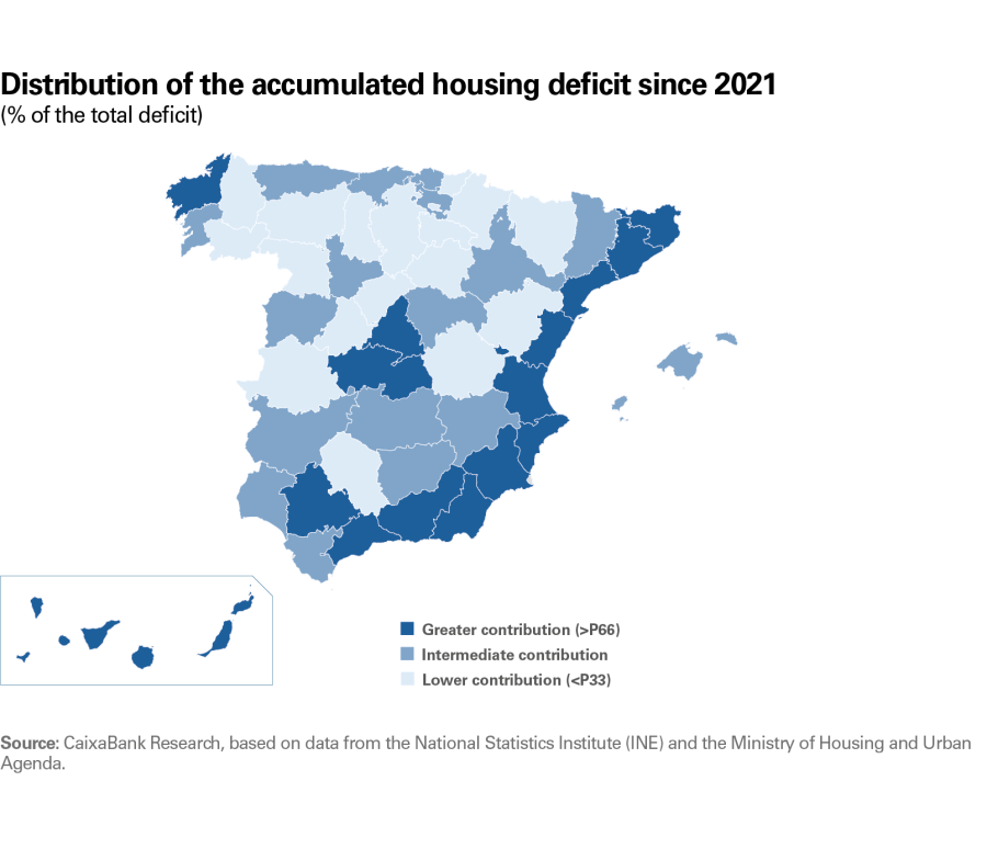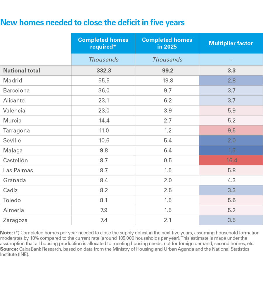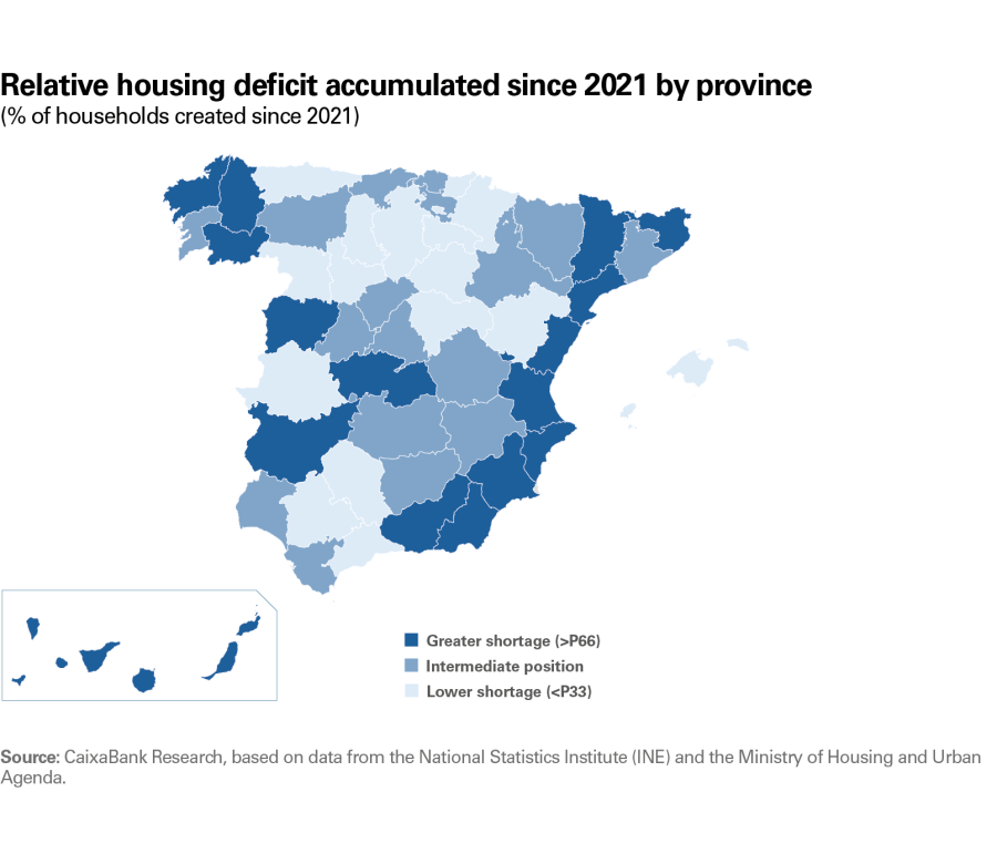 According to estimates by CaixaBank Research, Spain has accumulated a housing deficit, now exceeding 730,000 units, as a result of rapid household formation and an insufficient response from new construction. In this article, we review the extent of this mismatch and its impact on recent patterns in house prices, which are showing increasing tension across much of the country. We also observe that the construction of new homes is not accelerating, precisely in the regions where the gap between supply and demand is most pronounced, exacerbating the imbalances and prolonging the pressure on prices. Finally, we examine the factors limiting the recovery of supply (from rising construction costs to regulatory restrictions and the lack of land designated for development, in addition to infrastructure issues) and we anticipate little improvement in the short term in the sector’s capacity to meet current housing needs.