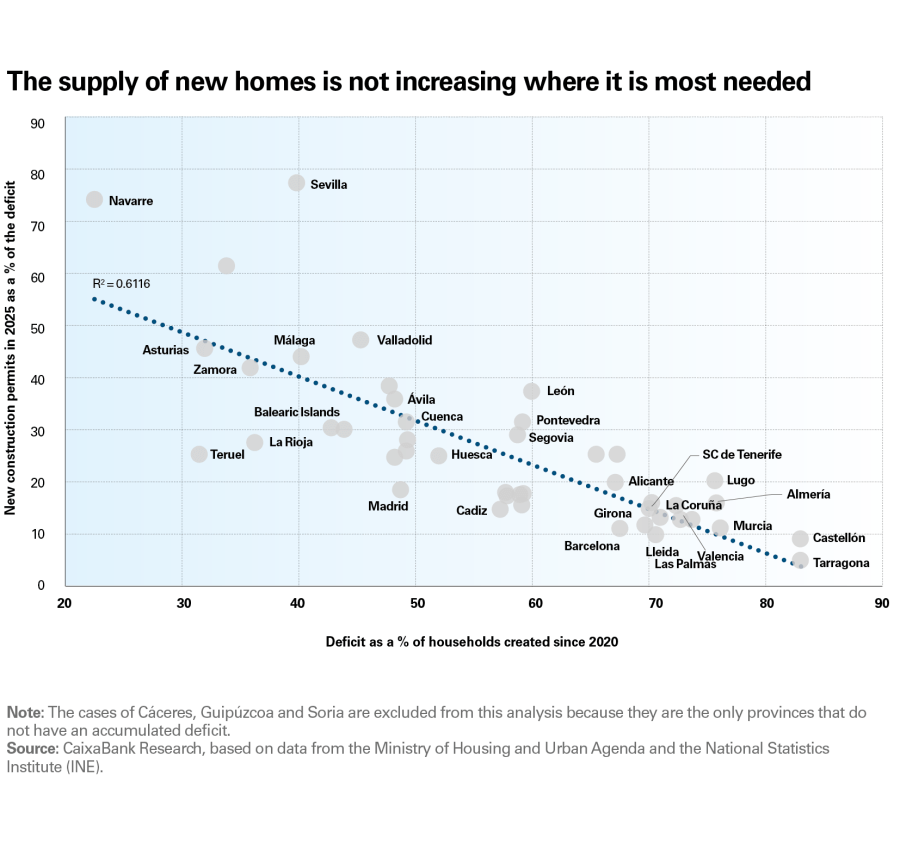In the following chart, for each province we compare the housing deficit (as a percentage of the total households created since 2020 in each province) with the new construction permits granted in 2025 (as a percentage of the accumulated housing deficit in the province). The chart reveals that the increase in the supply of new homes does not always occur where the deficit is greatest. Although the dispersion is high, a clearly negative correlation can be observed between the accumulated housing deficit and the growth of permits, revealing significant territorial imbalances. In provinces with relatively higher deficits (Tarragona, Castellón, Murcia, and Almería, among others), the new permits do not even cover 10% of the deficit, whereas others with lesser needs, such as Seville, Navarre, Córdoba, and Asturias, show an intense rate of new construction. This pattern indicates the existence of local constraints – such as land, regulation, costs, or administrative capacity – that limit the response from supply precisely in the most strained markets and contribute to the persistence of structural imbalance. As long as this imbalance persists, the deficit will continue to accumulate in the most strained provinces, maintaining upward pressure on prices and hindering affordability.