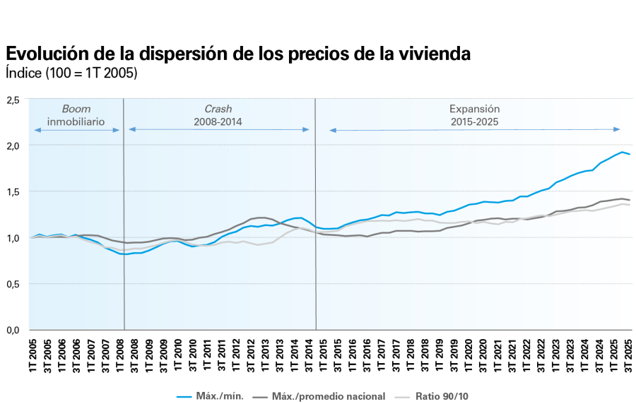 Este patrón actual de aumento continuado de la dispersión de los precios se constata en distintas métricas como, por ejemplo, (i) la ratio entre el municipio (>25.000 habitantes) con mayor precio y el de menor precio; (ii) el cociente entre el municipio más caro y el promedio nacional, y (iii) el cociente entre el percentil 90 y el percentil 10. Todas ellas describen el mismo perfil: reducción de la dispersión durante el boom inmobiliario, aumento durante el crash de 2008-2014 y un fuerte crecimiento de la dispersión durante la expansión que empezó en 2015.