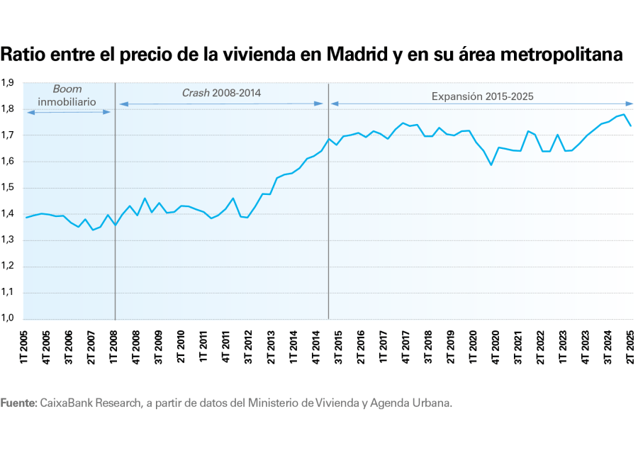 En el ciclo alcista actual, el patrón general se mantiene, aunque con matices relevantes. Durante la pandemia, las caídas en los centros de las áreas metropolitanas fueron más rápidas e intensas, reflejando un shock temporal sobre las preferencias residenciales y la movilidad. Sin embargo, desde comienzos de 2024 los precios en Barcelona y Madrid han vuelto a crecer más deprisa que en sus respectivas áreas metropolitanas. Y aunque en los dos últimos trimestres el crecimiento del ámbito metropolitano se ha aproximado al de los centros, los precios en las grandes ciudades se mantienen muy por encima de los de su área metropolitana desde una perspectiva histórica. Ello puede sugerir que, en los próximos años, la presión en los precios podría ser más intensa en los municipios de las coronas metropolitanas.