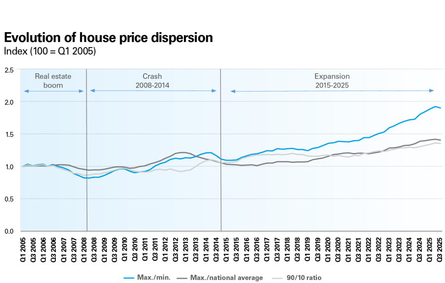 The pattern of a continued increase in price dispersion is evident in various metrics, such as (i) the ratio between the municipality (>25,000 inhabitants) with the highest price and the one with the lowest price; (ii) the quotient between the most expensive municipality and the national average, and (iii) the quotient between the 90th percentile and the 10th percentile. All of them describe the same profile: a reduction in dispersion during the real estate boom, an increase during the crash of 2008-2014, and strong growth in dispersion during the expansion that began in 2015.