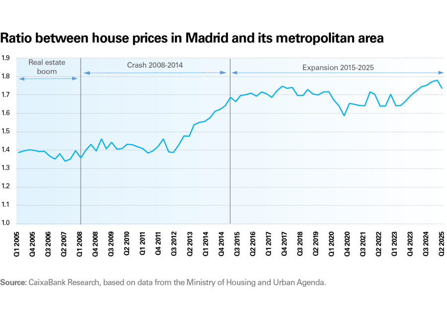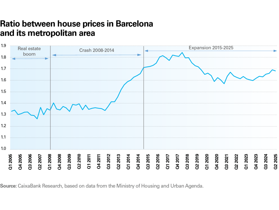 In the current expansionary cycle, the general pattern remains, albeit with some nuances. During the pandemic, the declines recorded in the city centres were faster and more intense, reflecting a temporary shock to residential preferences and mobility. However, since the beginning of 2024, prices in Barcelona and Madrid have once again grown faster than in their respective metropolitan areas. Moreover, although in the last two quarters price growth in the metropolitan area has approached that of the centres, prices in the major cities remain significantly higher than those in their metropolitan areas from a historical perspective. This may suggest that in the coming years, price pressures could be more intense in the municipalities of the metropolitan rings.