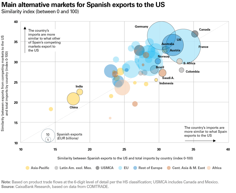 It is also important to note that, in a scenario with higher tariffs to enter the US market, Spanish firms will not be alone seeking alternative destinations and they will need to take into account the greater level of competition from other producing countries. Moreover, as shown by the arrangement of the bubbles along the diagonal line in the chart, it is precisely in these aforementioned markets that demand is more similar to Spain’s exports to the US, and in which competition will also be potentially high. In this regard, the relative positioning of Spanish firms seems to be somewhat more favourable in Colombia, South Africa, Saudi Arabia and Indonesia.