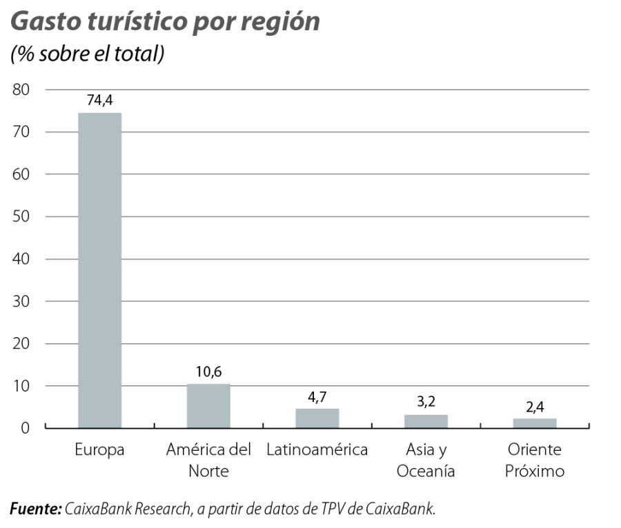Por el momento, los datos de tarjetas internacionales utilizadas en terminales de punto de venta de CaixaBank muestran que el gasto turístico internacional pasó de crecer un 10,7% interanual en febrero de 2026 a un 11,2% en marzo. Esta aceleración se explica, sobre todo, por el mayor dinamismo del turismo procedente del Reino Unido, Francia y Alemania, los tres principales mercados emisores de turistas hacia España. En conjunto, el gasto turístico de estos tres países se aceleró un 5,5% de media y situó el crecimiento de todos ellos en tasas de doble dígito.