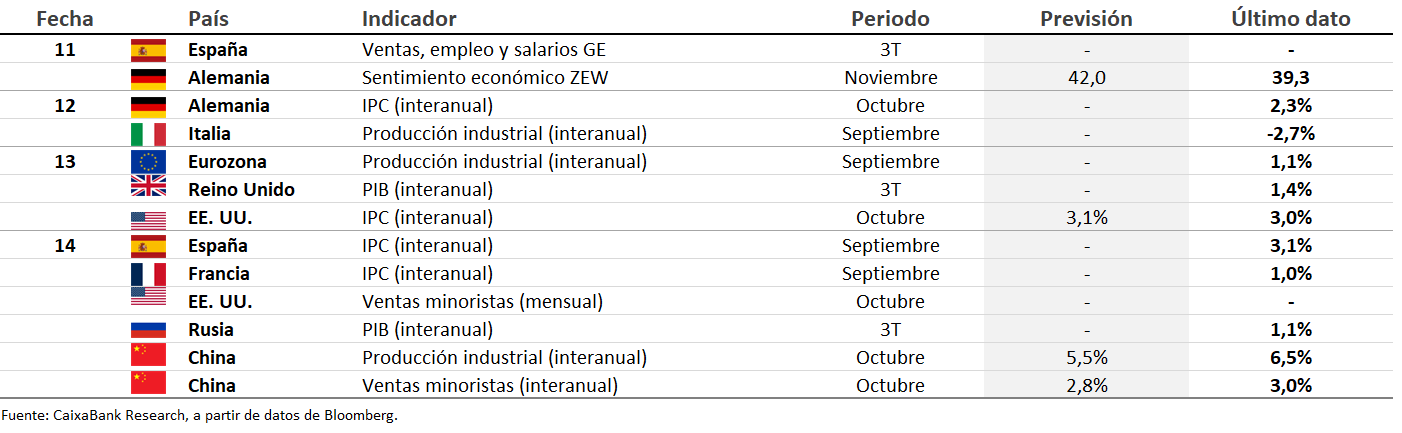 La combinación de un repunte en la creación de empleo según la encuesta ADP y una sólida lectura del ISM de servicios contrastaron con un récord de recortes de empleo según el índice Challenger, lo que no despejó la incertidumbre sobre la salud del mercado laboral y el rumbo de la política monetaria. Así, las expectativas de los inversores de un nuevo recorte de tipos por parte de la Fed en diciembre se movieron en un rango estrecho (entre el 60% y el 70%) y terminan la semana sin cambios netos relevantes. Esto se reflejó en una evolución dispar de los activos: la rentabilidad de los treasuries osciló, con caídas puntuales tras los datos de Challenger, pero sin un movimiento neto semanal significativo. También el dólar sufrió estos movimientos de ida y vuelta y cerró la semana sin apenas variación frente a sus principales pares, incluido el euro. En Europa, los tipos soberanos también se movieron en rangos estrechos, con ligeros repuntes tras unos PMI finales mejores de lo esperado, especialmente en Alemania, y con una leve ampliación de los diferenciales periféricos. La renta variable global cierra la semana con correcciones, lastrada por la toma de beneficios y las dudas sobre las valoraciones en el sector tecnológico, especialmente el estadounidense, con el Nasdaq mostrando el peor desempeño entre los grandes índices. En la eurozona, el retroceso fue igualmente generalizado, aunque el IBEX 35 logró cerrar en positivo, apoyado por el buen comportamiento del sector bancario. En materias primas, caídas del petróleo, en un contexto en el que la debilidad de la demanda global (acumulación de inventarios en EE. UU. y ralentización del ritmo de compras en China) no tiene visos de ser contrarrestada por los planes de reducción de la oferta, incluso aunque la OPEP+ haya decidido pausar los incrementos de producción a partir de enero. El precio del gas natural europeo, por su parte, repuntó impulsado por expectativas de mayor consumo estacional ante las previsiones de bajas temperaturas.