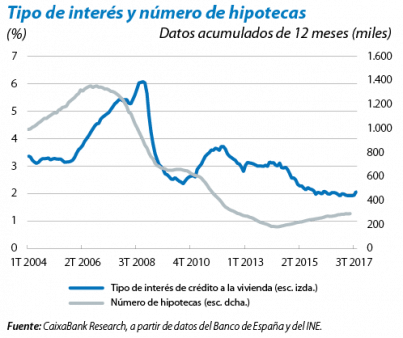 Hasta el momento, todo apunta a que el entorno de tipos seguirá siendo favorable. Si bien el BCE está empezando a cambiar el tono de su discurso, no se esperan subidas de tipos de interés hasta mediados de 2019 y, además, todo apunta a que serán muy graduales. En particular, prevemos que el tipo medio sobre el saldo vivo de crédito hipotecario se mantenga por debajo del 2,5% en los próximos dos años, muy por debajo del 5,0% que se registró, en promedio, en el ciclo anterior.2 Por tanto, se espera que los hogares más afectados por la crisis económica puedan seguir contando con el apoyo de un entorno de tipos de interés muy bajos.