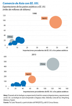 Sin duda, el impulso del Ejecutivo chino para abrir progresivamente la economía del país al comercio y la inversión internacionales ha propiciado este rápido desplazamiento del centro de gravedad de la cadena asiática de producción. El giro aperturista chino se inició en la década de los ochenta con la autorización de los flujos de entrada de inversión extranjera directa, incentivada además con la creación de cuatro zonas con privilegios económicos especiales. Un momento culminante llegó en 2001, con la incorporación del país a la Organización Mundial del Comercio, y la obligada reducción arancelaria que esta adhesión implicaba. Asimismo, el gran número de empresas chinas especializadas en el procesamiento de componentes o en el ensamblaje de los distintos bienes intermedios procedentes del resto de países asiáticos también ha favorecido la centralidad de China. Una mano de obra abundante y barata al inicio de este movimiento reformista de apertura fomentó este tipo de negocios. Como resultado, un gran número de las manufacturas «Made in Asia» que se consumen en EE. UU. o Europa tienen su última escala en China, donde después de darles los últimos retoques se cargan en alguno de los contenedores que abarrotan los atareados puertos del país (seis de los diez mayores puertos del mundo en capacidad de tonelaje se encuentran en el gigante asiático). No es extraño, pues, que año tras año China registre superávits comerciales abultados con la eurozona y EE. UU. (de 62 y 222 miles de millones de dólares, respectivamente, en 2013, lo que equivaldría al 1% y al 2,5% del PIB de China) y déficits con muchos vecinos asiáticos (del 1% con Corea o del 0,5% con Taiwán, por poner dos ejemplos).