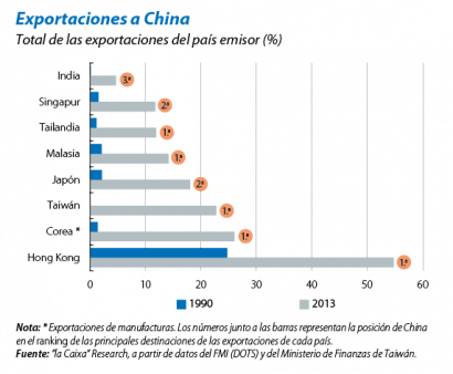 El papel de China es central en este entramado de relaciones comerciales y empresariales que conforman la «Fábrica Asia». Así, hoy en día, China absorbe la mitad de los bienes intermedios que exportan el resto de países asiáticos y les suministra cerca de un tercio de todos los intermedios que reciben del extranjero. Esto convierte al gigante asiático en el principal destino y origen de insumos de la región (obsérvese en el primer gráfico la importancia de China para sus vecinos en términos de comercio total). Se trata de una hegemonía indiscutible, pero relativamente reciente, pues en la década de los noventa el eje central de esta factoría de Oriente todavía se localizaba en Japón. No fue hasta mitad de la década de los 2000 cuando China conquistó la posición de líder (como se aprecia en el segundo gráfico).