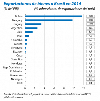 Un primer canal fundamental de contagio es el comercial. Así, los países más expuestos son los que tienen un nivel más elevado de exportaciones de bienes a Brasil: Paraguay, Bolivia, Argentina y Uruguay, que dirigen entre un quinto y un tercio del total de sus exportaciones al gigante sudamericano. No obstante, para tener una apreciación más ajustada del impacto económico deben relacionarse las exportaciones con el tamaño económico. Aquí cabe distinguir entre la situación más vulnerable de Bolivia y Paraguay (cuyas exportaciones representan, respectivamente, el 11,7% y el 9,7% del PIB nacional) de la de Uruguay (3,3% del PIB) y Argentina (2,6% del PIB).